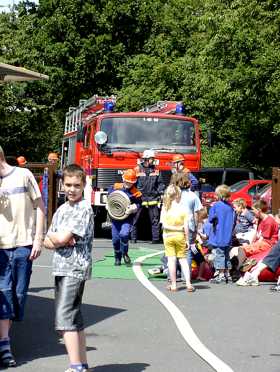 Bevor die Kinder zur Nachtwanderung aufbrachen und ihr Nachtlager in der Turnhalle einrichteten, sahen sie noch eine Löschübung der Jugend- feuerwehr. Auch die Polizei samt Motorrad machte die kleinsten neugierig und so standen die Florianjünger sowie der Schutzmann den Kindern noch für offengebliebene Fragen zur Verfügung. Nach anstrengender Nachtwanderung krabbelten die Kinder in ihre Schlafsäcke, und die Älteren ließen den Abend im Festzelt ausklingen. Zum gemeinsamen Frühstück am nächsten Morgen endete das Festwochenende dann auch für die noch müden Übernachter. |