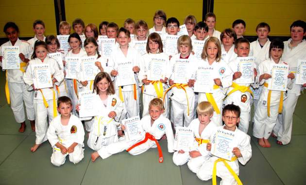 Traditionell ging es bei den Judofreunden mit 35 Prüfungskandidaten und zwei Prüfungskommissionen in die Sommerferien. Gut vorbereitet zeigten die Nachwuchsjudoka aus den Dienstags- und Donnertagsgruppen ihr Prüfungsprogramm, wobei die Judomeister hinter den Prüfungstischen durchweg zufrieden waren. Nach den geforderten Demonstrationen nahm man den Sportler aber schnell die nicht zu verbergende Anspannung, als es hieß: "Alle haben bestanden!" Mit erhalt der Urkunden und neuen Judogürtel war die Freude groß. Besonders ausgezeichnet wurden mit den besten Prüfungsergebnissen Vanessa Serra, Svanja Simon Linda Burgmann, Erik Kreik und Max Boller. |
