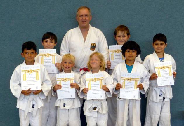 Die Nervosität war den sieben Judobonsais schon anzumerken, den immerhin stand das Septett vor einer ihrer ersten großen Herausforderungen, der Weiß-Gelbgurt-Prüfung. Die war aber auch genau so schnell verflogen, weil sie bestens vorbereitet die ersten Judo-Übungen problemlos meisterten. Und dies vor den Augen keines geringeren als Sensai und Vereinchef Hans-Werner Krämer (6.Dan) Der war auch sichtlich angetan von den hervorragenden Leistungen der Kleinsten, und sprach dabei den beiden Jüngsten, Mia Sophie Lorenzen und Marius Gille ein besonderes Lob mit den besten Prüfungsergebnissen aus. Der anschließenden Verleihung der Prüfungsurkunden stand nichts mehr in Weg. |