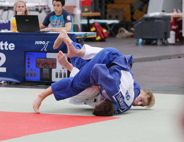 | Artur Rempel (blauer Judogi) lieferte eine tadellose Leistung ab und besiegt mit dieser Technik den Luxembuerger Pit Hilgert | ||