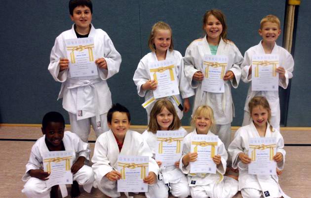 | Aber auch die kleinem Judofreunde sowie die Breitensportgruppe hatten eine lehrreiche Zeit im Trainingsdomizil der Judofreunde hinter sich gebracht. Die anfängliche Anspannung am Prüfungstag war schnell verflogen, und so konnten die Prüfer Stefan und Sandra Schnitzer, Hans Werner Krämer sowie Manuel Gabsa nur mit guten Benotungen die gezeigten Leistungen honorieren. Unter dem Applaus der neugierigen Zuschauer erhielten alle 13 Kyuprüflinge ihre verdienten Prüfungsurkunden. | ||