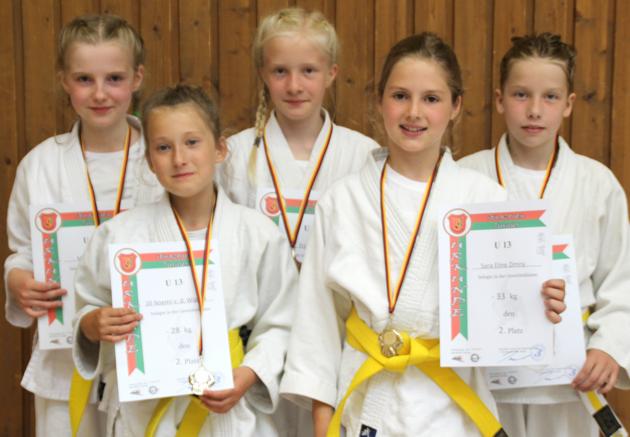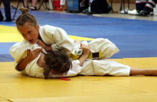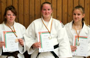 | Einzige Kämpferin in der Alterklasse U10 war Katharina Jantz. Sie schlug sich tapfer in der Klasse bis 30 kg und wurde dritte. In der Gewichtsklasse bis 36 kg waren mit Merle Zabel und Erja Kraft zwei "Judofreundinnen" eingewogen. Im vereinsinternen Duell musste Merle verletzungsbedingt aufgeben. In der Endabrechnung stand aber den Beiden die gewonnene Bronzemedaille gut. Auch Lena Voswinkel wurde dritte, konnte sich aber gegen ihre beiden Konkurrentinnen nicht durchsetzen. Luisa Kraft wurde fünfte | ||