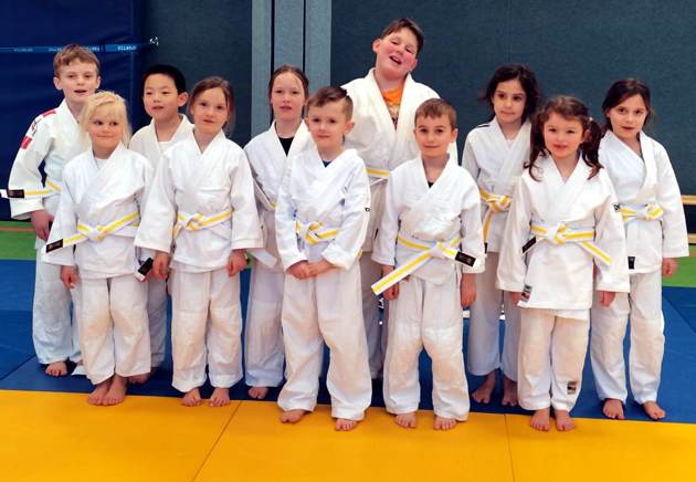 Unsere Anfänger Paul Schleifenbaum, Joline Gabsa, Migou Fan, Marla Krombach, Mila Krombach, Damian Härter, Jonathan Buchner, Luca Tallarico, Medina Coli, Hannah Meinhardt und Leona Diderle sind nun stolze Weiß-Gelbgurtträger |