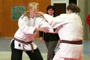 Zunächst kämpften die beiden Gäste gegeneinander (JKG - Walheim). Alina Schuster begann bis 52 kg verheißungsvoll mit Ausheber, doch Kathrin Bruch (-57 kg) war wohl noch nicht ganz wach. Bereits nach 11 Sekunden konnte Martinez für Walheim ausgleichen. Die Jüngste im Team Kyra Quast (- 70 kg) wurde ihrer Nominierung mehr als gerecht und siegte mit Beinfasser und Würger. Chantal Goergen konnte bis 63 kg den erneuten Ausgleich nicht verhindern. Und genau in dem Rhythmus ging es weiter. Leichtgewichtlerin Buket Aksehirli gewann kampflos und Nicola Seelbach (- 78 kg) lies sich mit Koshi-guruma überrumpeln. So musste der letzte Kampf mit Tamara Fligg (+78 kg) beim Stand von 3:3 die Endscheidung bringen. Die ging auch schnell mit Beinfasser in Führung. Doch dann drehte die Walheimerin auf und sorgte für die knappe Siegerländer Niederlage. |