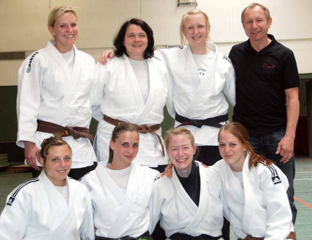 Am Ende des 2. Kampftages waren (hinten v.l.) Lea Diehl, Anke Pfeifer, Anna und Bernd Stausberg, sowie (vorne v.l.) Julia Rotthoff, Sabrina Stettner, Alina Schuster und Nadine Kremmling erleichtert. Es fehlt hier verletzt Erena Fligg die noch vor Ort ins Krankenhaus musste, aber doch mit der Mannschaft wieder den Heimweg antreten konnte |