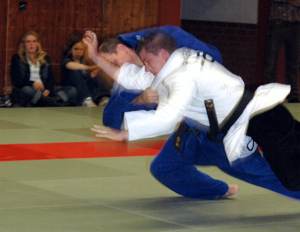 Mit Mathias Feld (-60 kg) wurde die Begegnung eröffnet. Der lag schnell mit 2 Strafen hinten und konnte den Griff des Gegners nicht kontrollieren. Mit Innensichel wurde dann der 0:1 Rückstand eingeläutet. Auch der Schwergewichtler Mark Fengler wirkte irgendwie konsterniert und musste mit Abtaucher den nächsten Punkt zulassen. Aber es kam noch schlimmer. Auch der Niederländer im JKG-Team, Thomas Leppink (81 kg), hatte Schwierigkeiten in den Kampf zu finden. Und so hieß es wiederum durch eine Abtauchtechnik 0:3, was schon so etwas wie eine Vorentscheidung war. Doch verloren war bei vier noch ausstehenden Kämpfen augenblicklich nichts. Der zweite Holländer der Mannschaft Paul Maskant (-100kg) holte nach lange ausgeglichenem Kampf den Anschlusspunkt. Und nach dem der Newcomer Achim Schneider, der mit nur 57 kg für den verletzten Sven Steiner bis 66kg einspringen musste mit einen wirklich taktischen Meisterleistung ein nie erwartetes Unentschieden holte, keimte noch mal so etwas wie Hoffnung auf. Doch Markus Longeru (-90 kg) und Alexander Umirsakow (-73 kg) der gegen den niederländischen Auswahlkämpfer Willmees ran musste, verstanden es nicht ihre Chance zu nutzen. Damit war die dritte und höchste Niederlagen mit 5:1 gegen den VfL Hüls besiegelt |