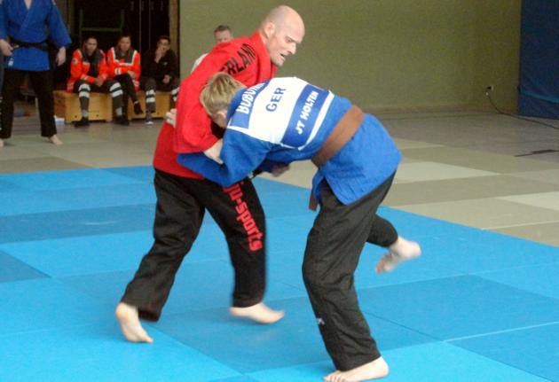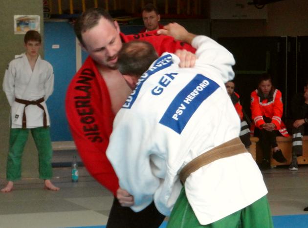 | In der ersten Begegnung ging es Schlag auf Schlag für die heimischen Judoka. Marco Werder (-66 kg) schlägt seine Gegner mit Schenkelwurf nach nur 15 Sekunden. Marcel Meyer legt im Schwergewicht mit einem Fußwurf nach. Tim Burk (-90 kg) siegt eindrucksvoll als Debütant in der Oberliga mit Harai-goshi. Als dann noch Leicht-gewicht Matthias von der Wippel-Feld mit Schulterwurf siegte war die JKG uneinholbar mit 4:0 davon gezogen. Bis 100 kg holte Murat Akbayrak, der nach langer Verletzungspause langsam wieder zur alten Form zurückehrt, den fünften Punkt mit zwei Waza-ari Wertungen. Marvin Joest musste bis 73 kg gegen den Holtener Denny Koppers den Ehrenpunkt zulassen, bevor Alexander Umirsakow (-81 kg) dem 6:1 Kantersieg nach nur 30 Sekunden mit einer Abtauchtechnik die Krone auf setzte. | ||