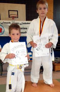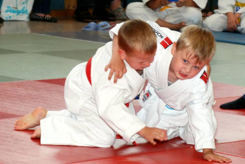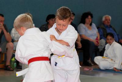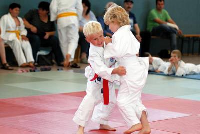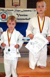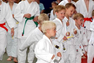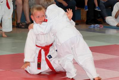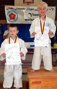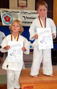 Am zweiten Tag standen fast 40 junge Judoka auf der Matte um die begehrten Vereinstitel zu ergattern. Im völlig überfüllten Trainingsdomizil der Judofreunde wurde es dann auch gleich stimmungsvoll, weil es sich die Eltern, Omas, Opas oder Geschwister nicht entgehen lassen wollten ihre Kleinen im manchmal viel zu großen Judogi zum ersten mal auf der Matte kämpfen zu sehen. In 14 Gewichtsgruppen ging man auf Medaillenjagd und am Ende gab es sogar 15 Titelträger. Angefangen mit den Kleinsten, die Minis, gab es spannende, aber auch unterhaltsame Begegnungen zu sehen. Gleich in der ersten Gewichtsgruppe kochte die Stimmung in der Halle weil sich die gerade mal 17 kg leichten Judozwerge Marius Gille und Nick Sening einen so tollen Fight ablieferten. In der Gewichtsgruppe 11 durften sich Jennifer Malik und Nina Berg den Titel teilen, weil es in ihrem dramatischen Finale keiner Verlierer gab. Viel Applaus ernteten alle und konnte am Ende stolz ihre gewonnenen Urkunden und Medaillen zeigen. |