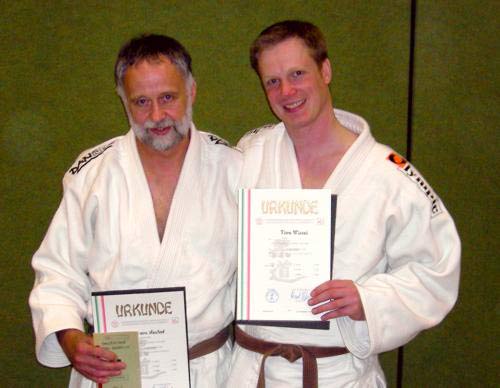 Der schwarze Judogürtel gehört ab sofort zur Judokleidung von Timo Wissel. Nach einer über 4-monatigen Vorbereitung, durch den Kreis-Dan-Vorsitzenden Sören Leopold und seiner Vertreterin Claudia Heimann, konnte Timo Wissel jetzt vor der Prüfungskommission in Wiedenbrück glänzen und gehörte mit zu den besten Absolventen. Hervorragende Unterstützung erhielt der Judofreund bei der Nage-no-Kata durch den 16-jährigen Rainer Winkel vom HC Freudenberg der für Wissel ein hervorragender Uke (Fallpartner) war. Damit bereichert der langjährige Judotrainer der Judofreunde den Verein für die Ausbildung der Nachwuchsathleten, die hiermit bereits über 6 Judomeister verfügen. |
